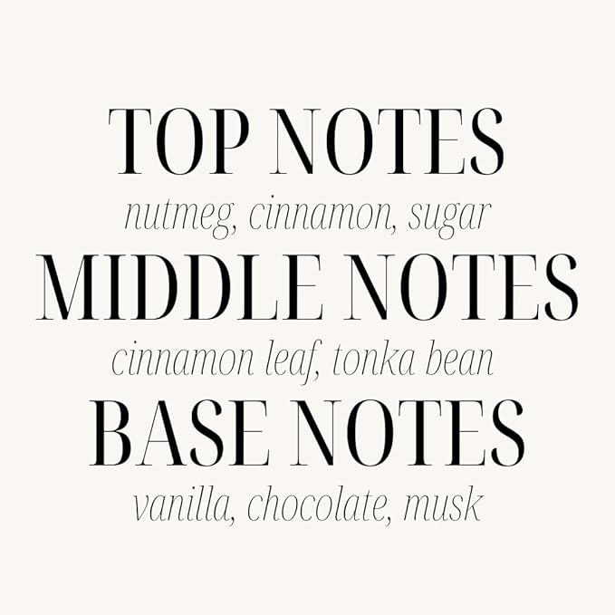 • Top notes: nutmeg, cinnamon and sugar, Middle notes: cinnamon leaf and Tonka bean, Base notes: vanilla, chocolate and musk