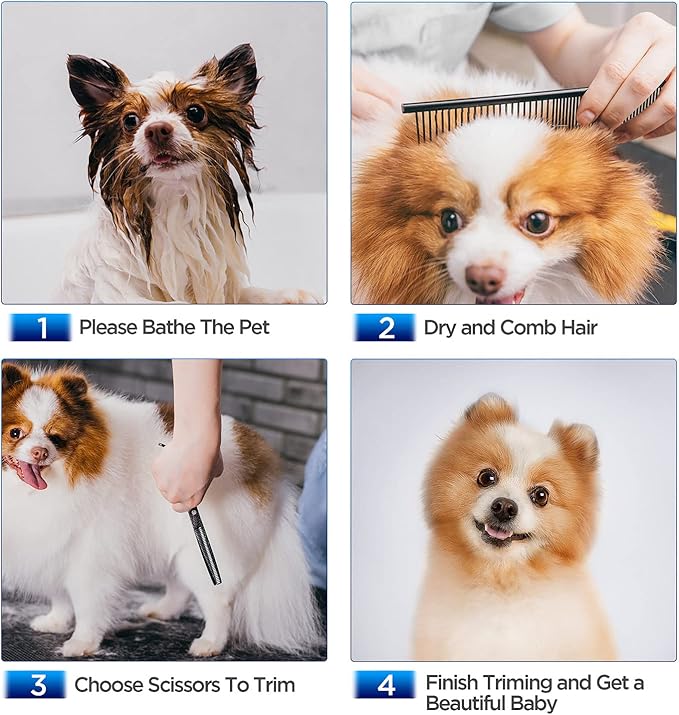 • 【5 in 1 Dog Grooming Scissors Set】The dog grooming scissors set comes with 1 straight scissors, 1 thinning scissor, 1 curved scissor, 1 grooming comb and 1 storage case