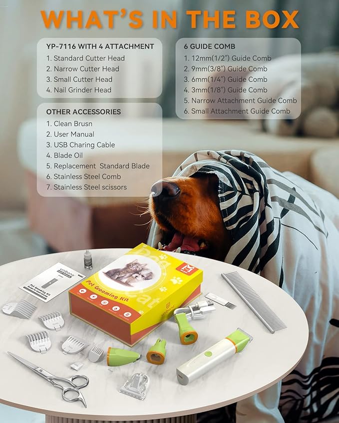 - The Same Money to Get Four: The 7116 dog and cat grooming kit adopts a detachable cutter head design with 4 replaceable cutter head attachments — standard cutter head,narrow cutter head,small(details) cutter head and nail grinder head, which can be quickly replaced with just one pull and one push to meet the needs of dog and cat body trimming. Save your money now!