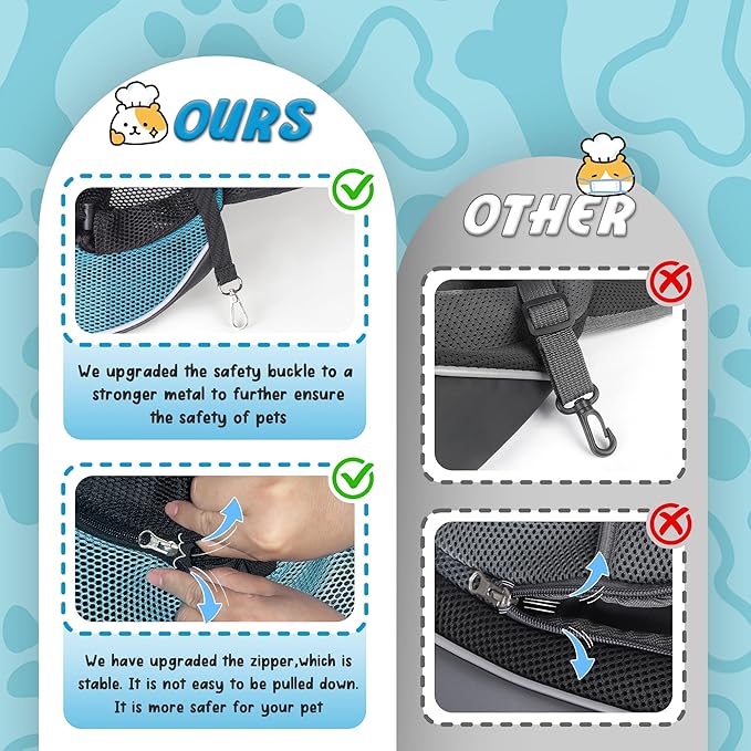 • Multi-safety Design: WOYYHO pet sling carrier has a metal safety buckle, prevents pets from jumping out, magic stick to avoid zips from sliding, the unique anti-pinch design can prevent pet hair from being caught by the zipper, and the reflective strip design makes it safer for you and your pets to go out at night