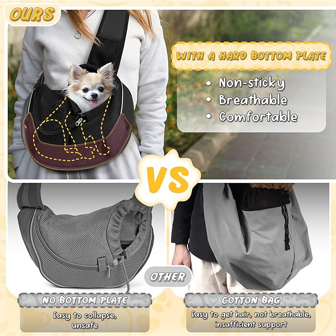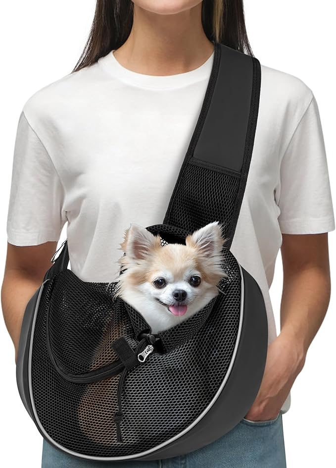WOYYHO Dog Sling Carrier - Adjustable Strap,Hard Bottom,Large Zip Pocket,Breathable Mesh - Suitable for Puppies Outdoor Travel (Black S)
