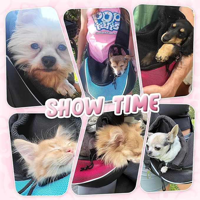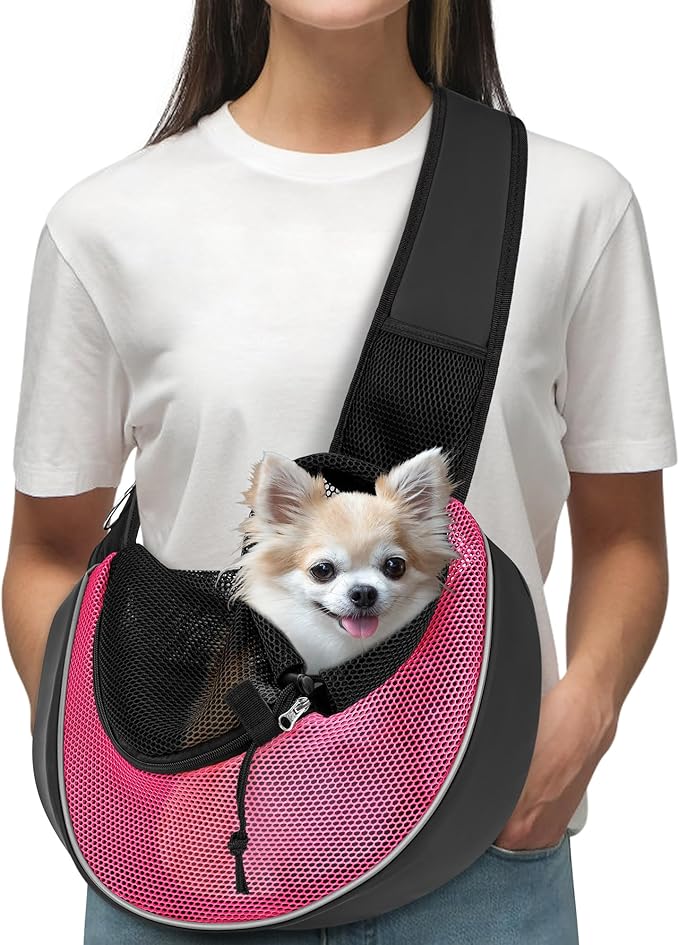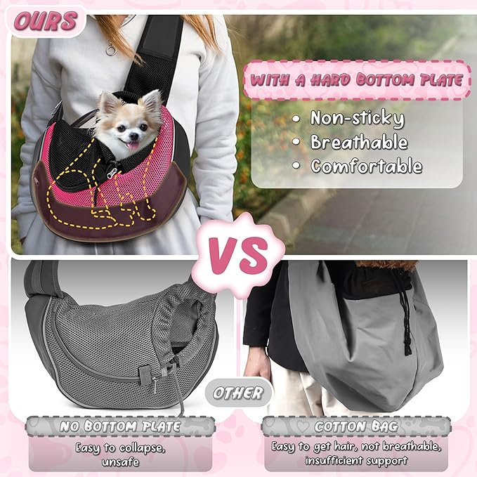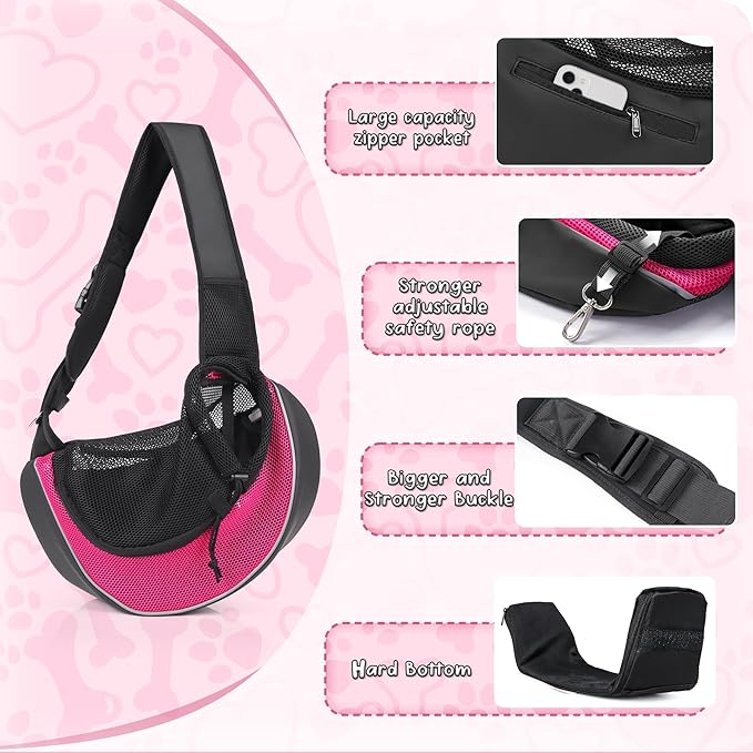 WOYYHO Dog Sling Carrier - Adjustable Strap,Hard Bottom,Large Zip Pocket,Breathable Mesh - Suitable for Puppies Outdoor Travel (Pink S)