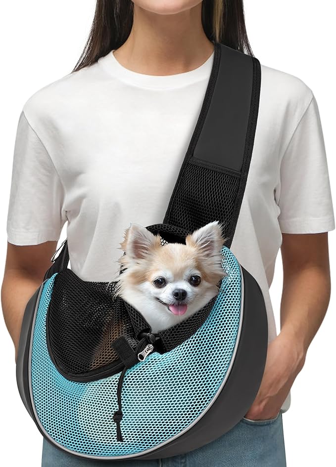 WOYYHO Dog Sling Carrier - Adjustable Strap,Hard Bottom,Large Zip Pocket,Breathable Mesh - Suitable for Puppies Outdoor Travel (Cyan M)