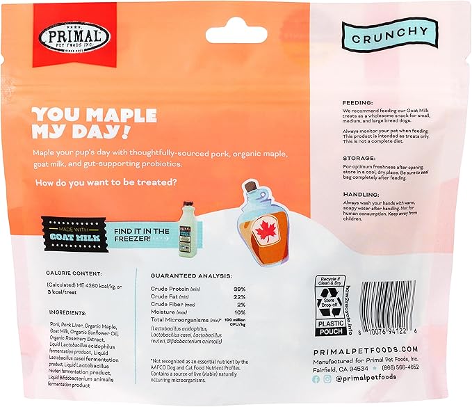 Primal Freeze Dried Dog Treats; Pork & Maple Dog Treats with Goat Milk for Dogs, You Maple My Day, Grain Free Training Treats for Dogs with Probiotics, 2 oz (Pack of 2)