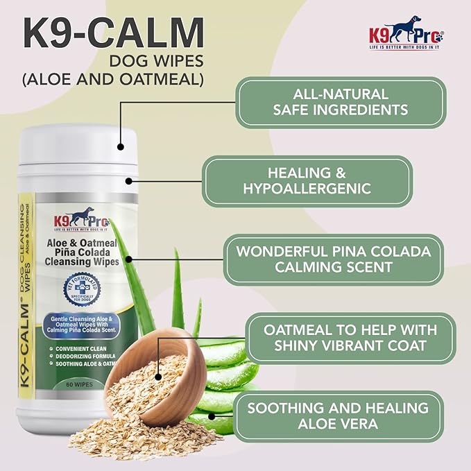 - Proudly Made with Love in the USA! Your dog deserves the best, and that’s why we use only safe and premium ingredients in our K9 Pro Dog Wipes. The oatmeal and aloe ingredients help soothe hotspots, itchiness, and rashes. The calming infusion of pina colada will soothe your excitable pooch, and make clean-up easy and enjoyable. You can feel good knowing our cleaning & deodorizing dog wipes are made right here in the beautiful USA! Your dog’s health is our top priority