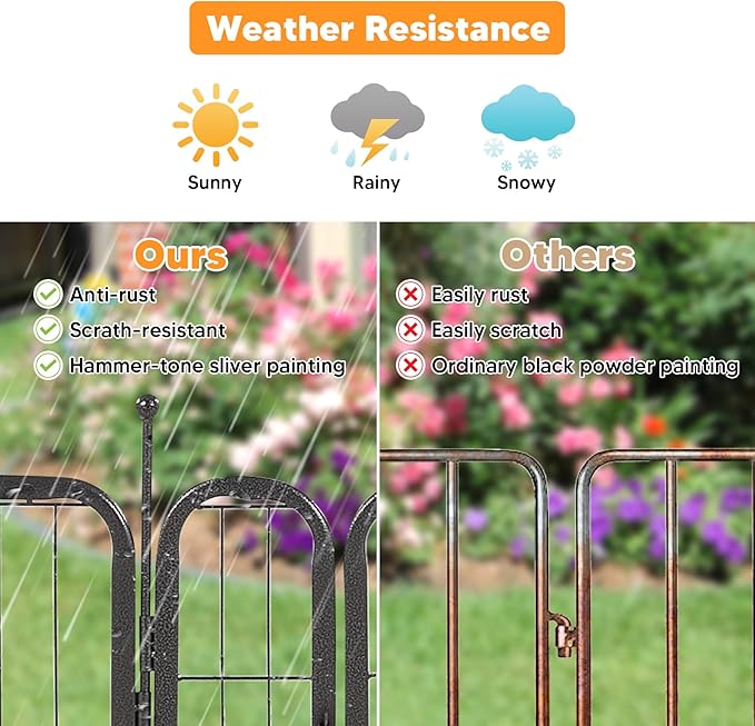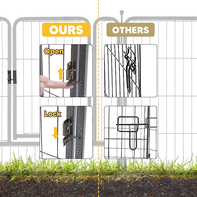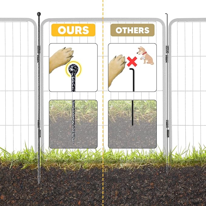 • 🐶Upgraded Pet Playpen: Adopts double new type door lock design, much safer and more convenient. Made of heavy duty metal panels and stakes with thick powder coating, non-toxic, anti-rust, and waterproof. Ensures long time use no matter indoor or outdoor. Smooth surface without burrs, the stakes are more easily inserted into the ground for more stability and rigidity.
