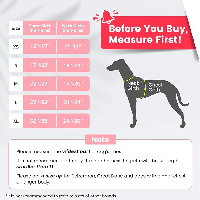 This size XXS harness is perfect for my small, 3-month-old puppy. The neck and chest measurements fit perfectly! It's easy to use, and the color is adorable. The padding is secure yet comfortable for him, and it's super easy to wash. I also bought the matching leash and love them both!