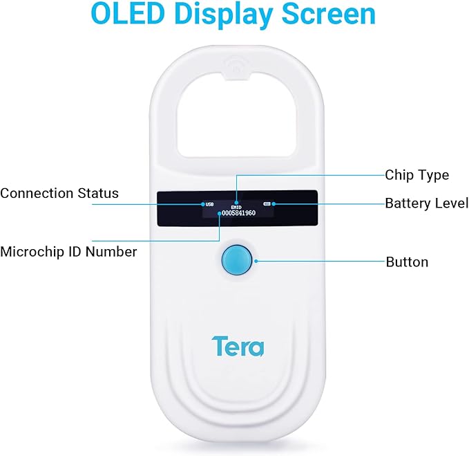 • ใ€OLED Display Screenใ€‘ Teraโ€™s handheld pet reader uses a high brightness OLED display, which can be clearly displayed under indoor light or strong outdoor light/sunlight conditions.