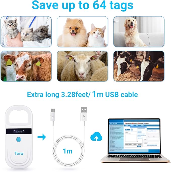 • ใ€Sufficient Data Storage Capacityใ€‘ Tera Pet Scanner has extremely fast scanning speed and can save up to 64 tags information, you can upload these information to your computer via USB cable.
