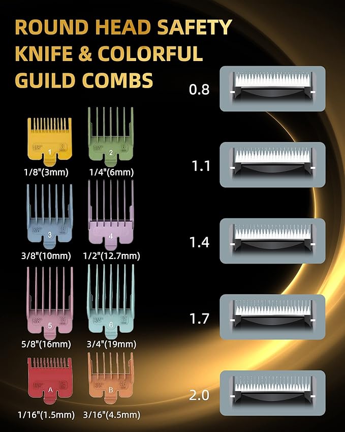 • 【Complete Grooming System】8 color-coded comb guides cover all coat types: 1.5/3mm: Paw pads & sanitary trims. 4.5/6mm: Summer cuts & short styles, 10/13mm: Teddy/Poodle body shaping, 16/19mm: De-shedding & undercoat removal