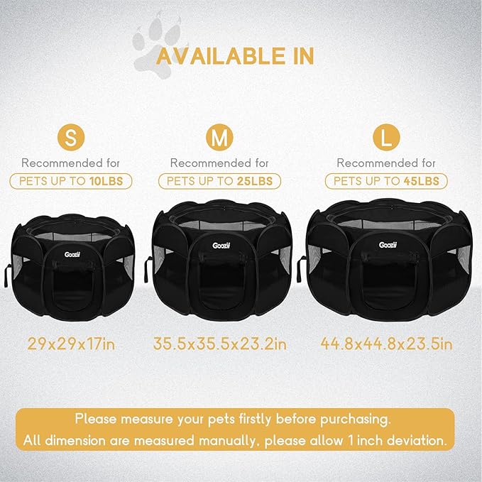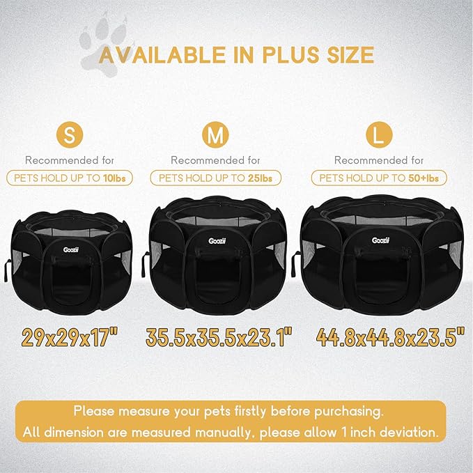 • 【Spacious & Comfort】: This dog playpen keeps your pet stay in this pet playpen secure, spacious interior give more fun for your pet. Size is 29*29*17 inches, great for small animals up to 10 LB. There are 1 inch error range because of technical issue. The portable cat playpen is also a ideal present for cat lovers as Christmas gifts.