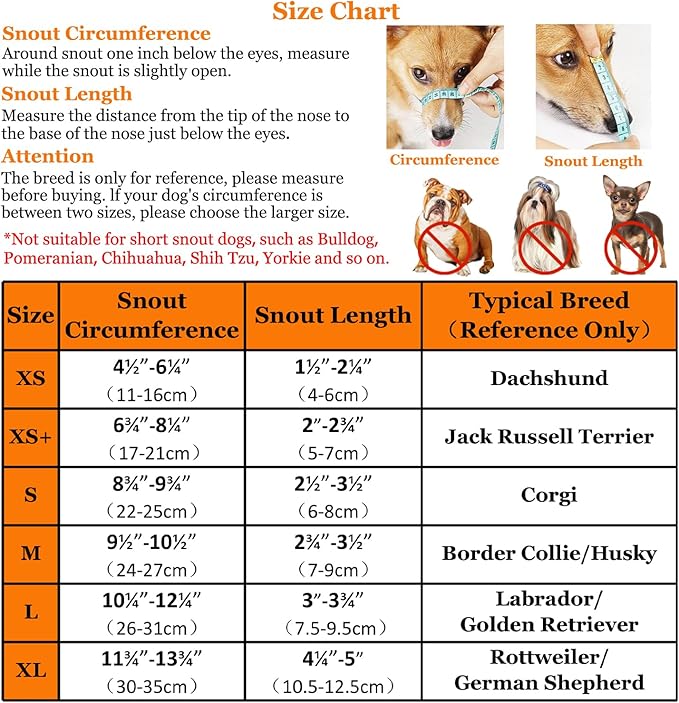 • How to measure: Use a soft tape measure to measure your dog's snout circumference and length. The measurement should be taken 1 inch away from the eyes. If your dog's measurements fall between two sizes, choose the larger size.