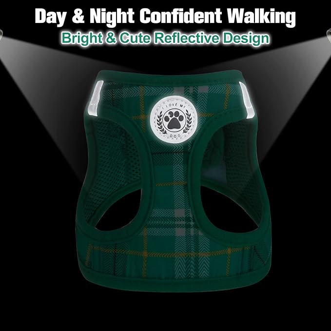 - 🐶Comfortable and Reflective ---Adjustable dog harness features colorful plaid and breathable mesh fabric, comfortable to wear and will not stick to the dog's hair. Reflective strips deign reflect ambient light in low light conditions, making you and your dog safer when walking and moving around at night without worrying about blurred vision in the dark.