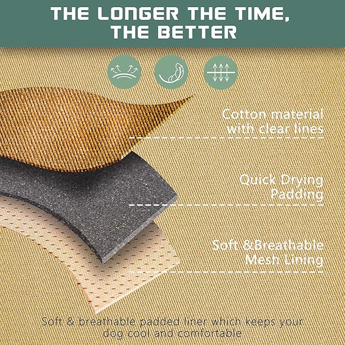 • 🐾DUARABLE & BREATHABLE MATERIAL: All Day Comfort.🐾 The heavy-duty vest made of soft cotton fabric with clear texture for the beautiful appearence. Extra durability and wear-ability, suitable for all field use. The soft padding can protect your dog's skin, while the breathable air mesh keeps your dog ventilated and comfortable. We will protect the comfort and health of the dog together with you.
