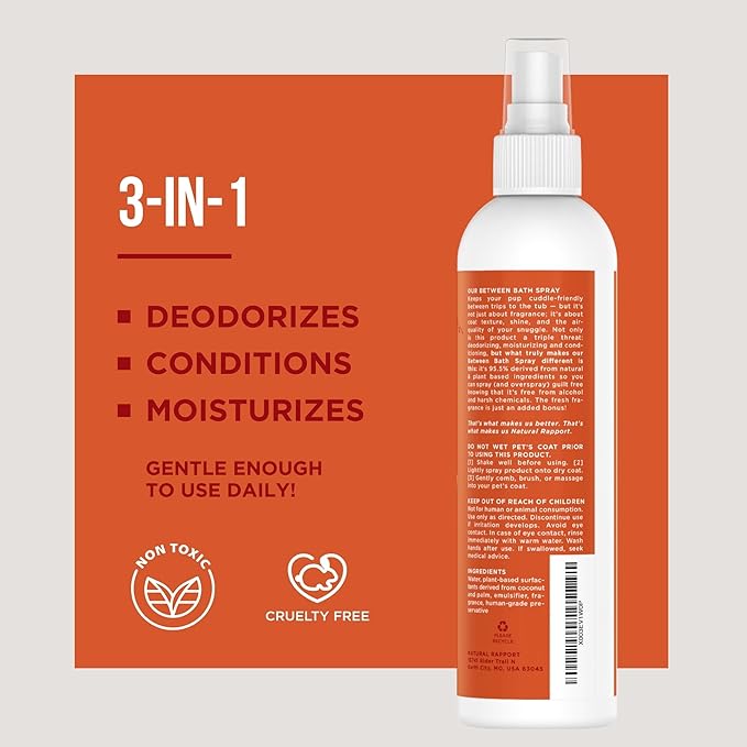 • 3-IN-1 FORMULA - The spray keeps your dog's fur smelling fresh & clean between shampoo baths and also helps to condition. This pet deodorizing spray is an ideal addition to your pup's fur care routine. It works well to fight any pee-scented fur.