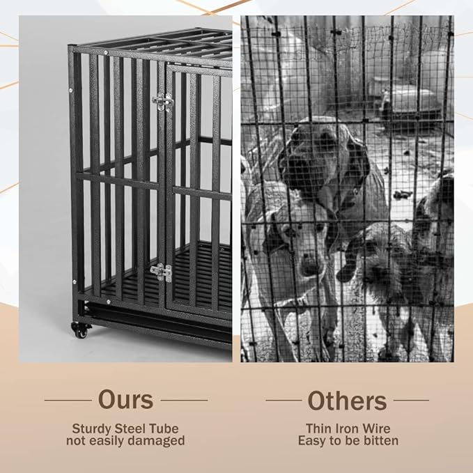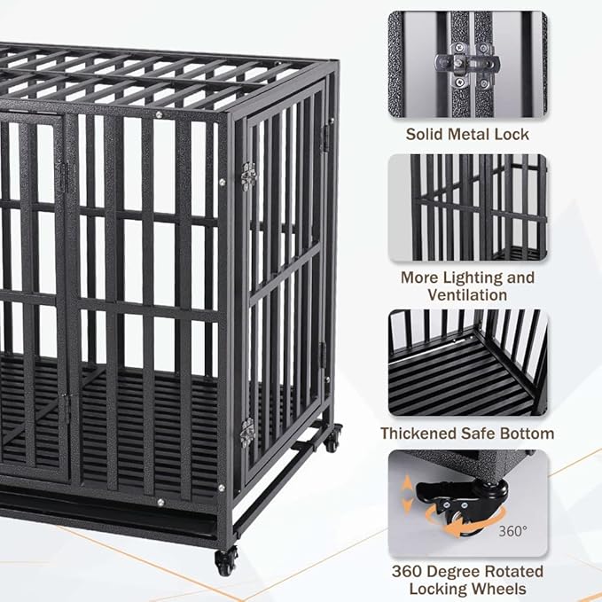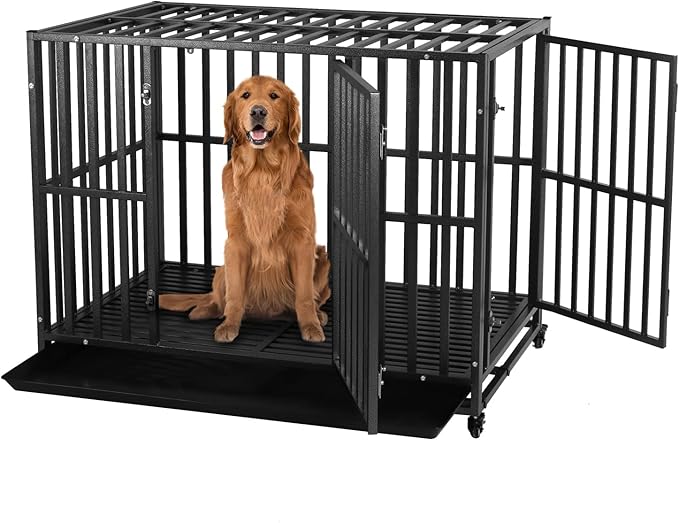 • Dimensions: The heavy duty dog cage measures 43.3"L X 29.9"W X 34.6"H, internal height of the dog cage (excluding wheels) is 32.2"H, providing enough space for your dog. Our big dog crate with wheel is ideal for most medium and large dogs. Equipped with a 3-year warranty, if you have any questions, please contact us immediately, we will reply to you within 24 hours