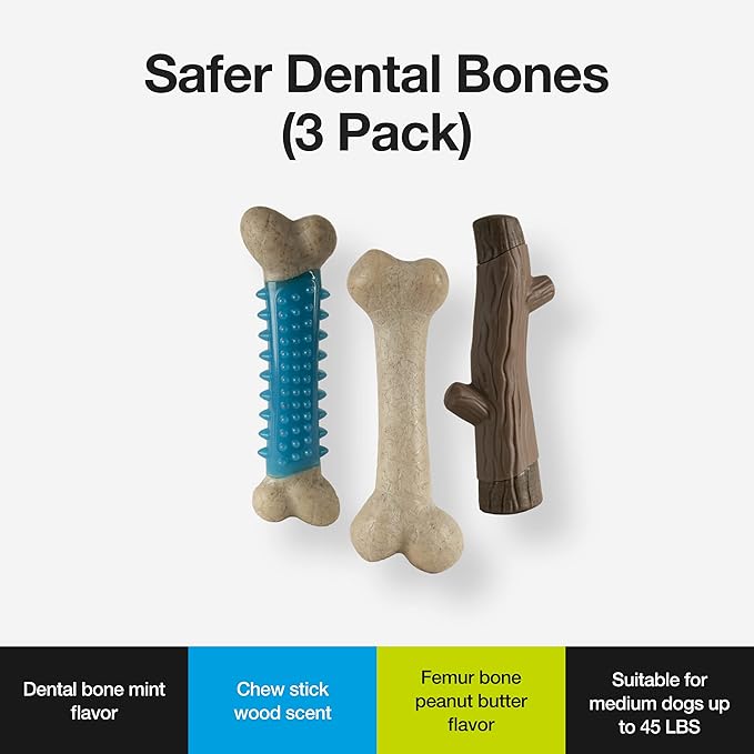 • FOR MEDIUM DOGS: Our bundle is meant to promote healthy teeth & gums by using flavors that we know your best friend will enjoy. With mint used for the dental bone, a wood-scented femur, & a chicken dental treat, your dog will have that tail wagging!