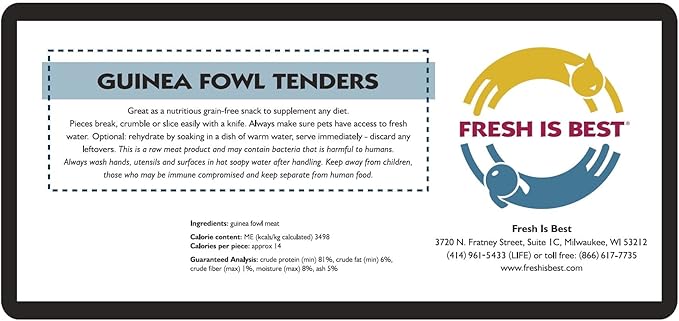• Guinea Fowl Tenders - This 3 oz bag contains only fresh freeze dried high quality guinea fowl breast. All natural raw meat, no added hormones, preservatives, or fillers. 100% grain, gluten and starch free, human quality ingredients.
