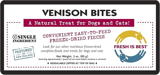 • Venison Bites - This 3 oz bag contains only fresh freeze dried high quality venison meat. All natural raw meat, no added hormones, preservatives, or fillers. 100% grain, gluten and starch free, human quality ingredients.