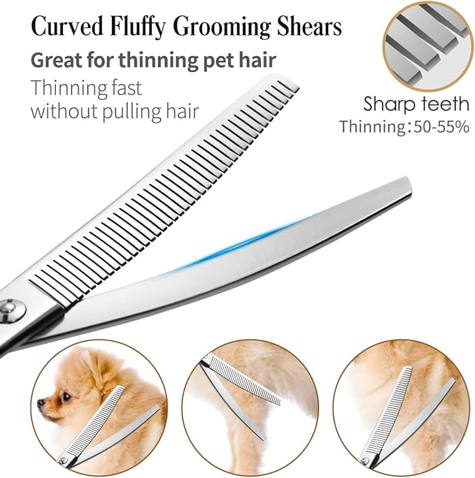 • 🐶[Fluffy Effect] With 42 teeth in the comb-tooth blade and a sharp convex edge. After using the trimmers or push shears, these curved thinning shears smooth out jagged fur, blending raw shear marks of hairs and thinning out thick coats, leaving your pet looking fluffy and super cute.