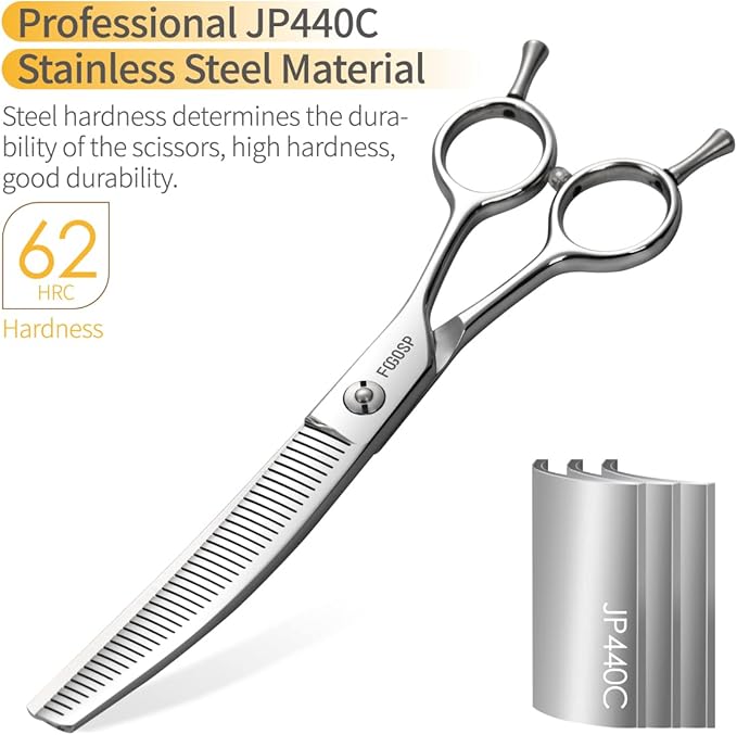 • 🐶[Finest Material] Cold treatment high quality and durable Japanese 440C stainless steel shears with 42 comb teeth, 35% thinning rate. FOGOSP curved comb grooming scissors are tempered with Hand-sharpened cutting edges and precise, convex edge, hollow-ground, extremely sharp blades, which are not easy to pull or catch fur ends.