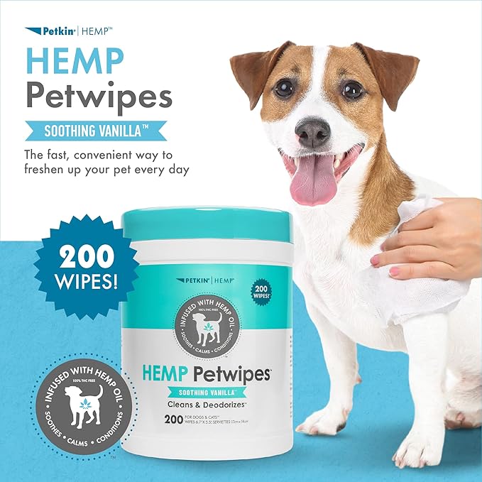 • Petkin Pet Wipes For Dogs and Cats - Our Hemp grooming wipes are a fast, convenient way to keep your pet clean and healthy every day. These calming dog wipes are extra gentle and ideal for daily use around your pet's eyes, ears, face, body and butt. Includes 200 wipes.