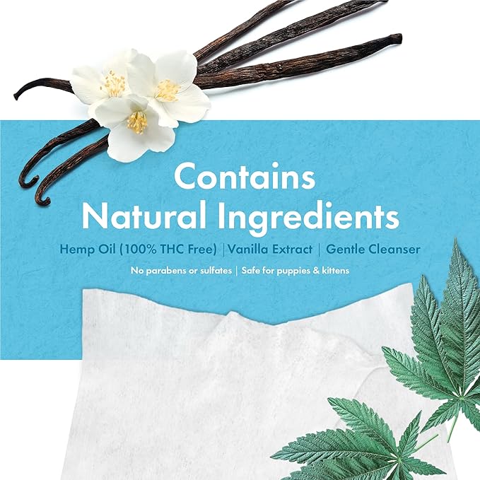 • Soothes, Calms & Conditions - Each wipe is moistened with a gentle cleansing formula combining Hemp Oil and soothing vanilla extract to clean, condition and soothe itching and irritation. Won't remove spot flea treatments. 100% THC free.