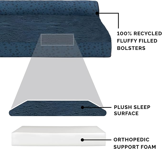 Furhaven Orthopedic Dog Bed for Large Dogs w/ Removable Bolsters & Washable Cover, For Dogs Up to 125 lbs - Plush & Almond Print L Shaped Chaise - Blue Almonds, Jumbo Plus/XXL