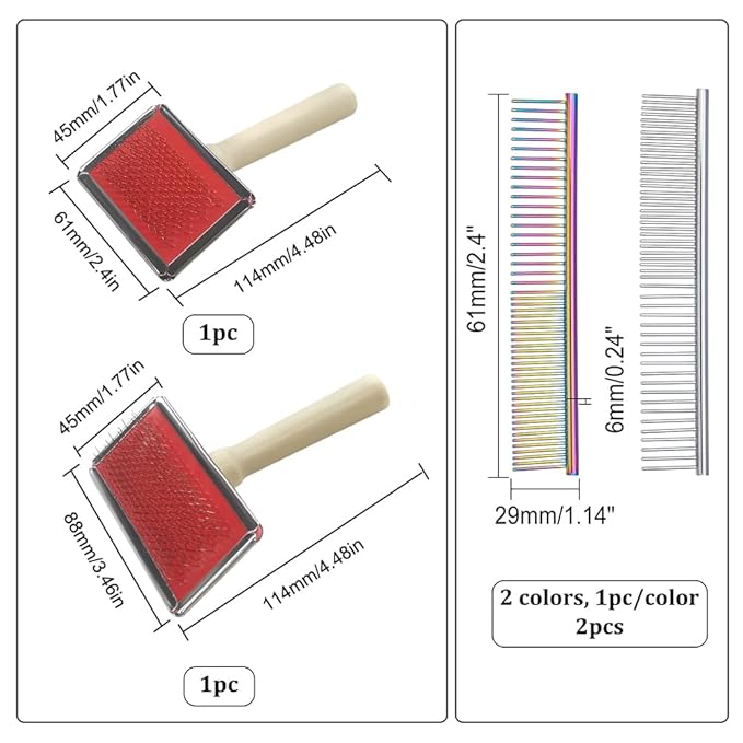 • Size Information: Stainless Steel Pet Combs with Wooded Handle is about 125x61x25mm, head: 61x43mm, and Stainless-Steel Pet Combs is about 112x88x23.5mm, head: 88x44mm.