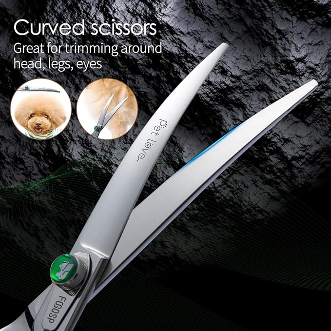 - 💖[Excellent Quality]FOGOSP dog grooming scissors is made of high quality Japanese 440C stainless steel and is very sharp and smooth that using these grooming scissors is like cutting butter with hot knife. Custom Leaf-Spring Tension Modifier Knob, making more silky smooth to use. Classic low-press offset handle making them comfortable and lightweight to hold, effectively avoid wrist joint injury.Good Tools Make You Enjoy Your Work Even More.