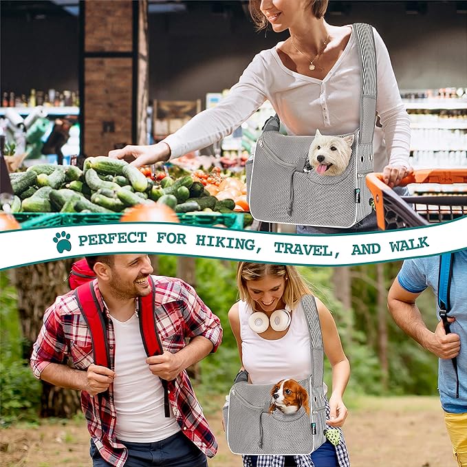 - CROSSBODY PET POUCH PURSE: The dog front carrier comes with a poop bag dispenser feature pocket, a large pocket on the back to store pet stuff, treat, food, toy, and a mesh pocket on the shoulder strap for essential personal items, phone and cards. The strap is adjustable, sturdy and durable, with a reinforced buckle and D-ring on the side for safety and convenience. This cute cat sling carrier chest is easy to wear and carry. Ideal for hands free situation just like puppy back pack and bookbag.