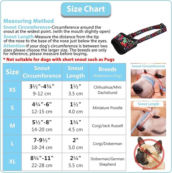 • Dog Muzzle for Large Dogs-Size L is suitable for snout circumference between 7" and 9½", and snout length that is greater than 2”. Please measure twice before buying. The large dog muzzle is fit for Doberman, Corgi, Beagle, and so on. If you have any problems with sizing, we are happy to help you.