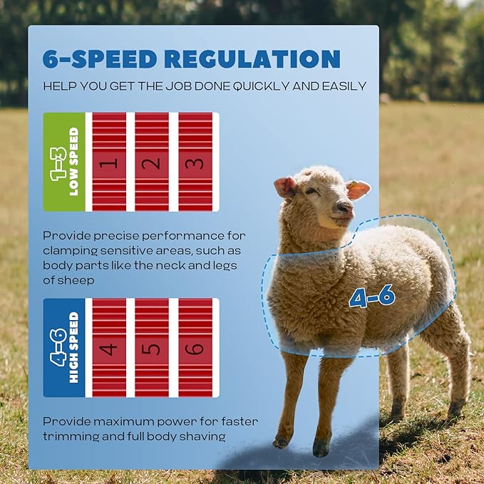 - EQUIPPED WITH 6 VARIABLE SPEED - The LuzRise professional shears are equipped with 6 variable speed knobs, so whether you are a beginner or a professional, the 6-speed control will help you get the job done quickly and easily. The low speed (1-3) provides precise performance for clamping sensitive areas, such as body parts like the neck and legs of sheep, while the high speed (4-6) provides maximum power for faster trimming and full body shaving.