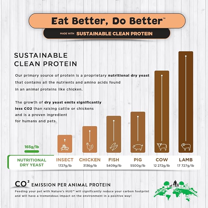 • SUSTAINABLE COMPLETE PROTEIN – Our primary source of protein is a plant-based, dry yeast that provides all essential amino acids and nutrients, similar to animal proteins found in chicken, making it a top choice for vegan dog food and dry dog food options. This eco-friendly protein emits significantly less CO2 than traditional meat sources, supporting a more sustainable, plant-based diet for dogs.