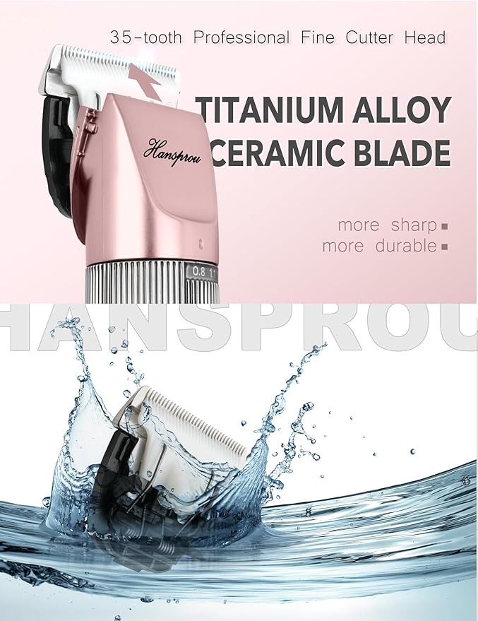 • High Quality Titanium Alloy Blade + Ceramic Moving Blade: Hansprou dog trimmers provide excellent cutting performance for thick coats.Detachable blades are easy to change and clean. Compared with ordinary, Hansprou's special 35-tooth cutter heads are sharper, more durable and more efficient.For example, long-haired rabbits, which can not be cut hair by other clippers, but Hansprou cutter heads can do it