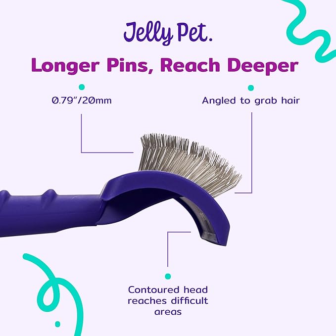 - LONGER PINS - The Jelly Pet Universal Slicker Brush pins are longer than most slicker brush pins and perfectly angled. This "Tuffer Than Tangles" slicker brush allows you to penetrate the coat better and remove more hair. This will also stimulate hair follicles to encourage healthy growth. Each pin reaches more than ¾” deep and is angled at the end to grab the undercoat. Less tangles, and less shedding.