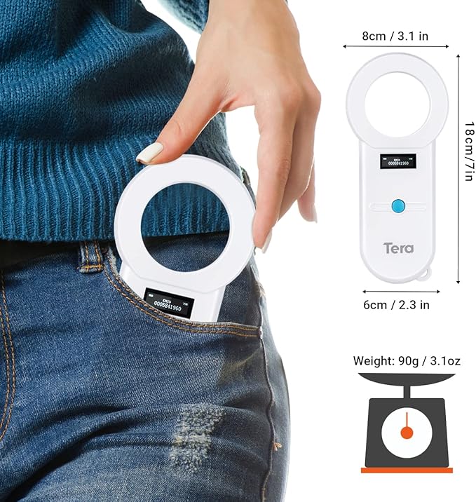 Tera Pet Microchip Reader Scanner RFID Portable Animal Chip ID Scanner with OLED Display Screen Rechargeable Data Storage Tag Scanner Supports EMID FDX-B(ISO11784/85) for Dog Pig Animal Management H01