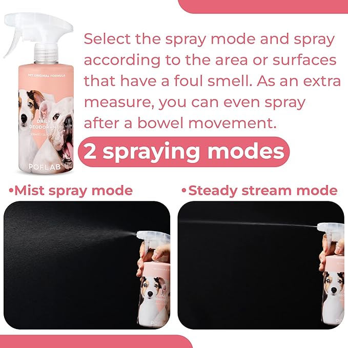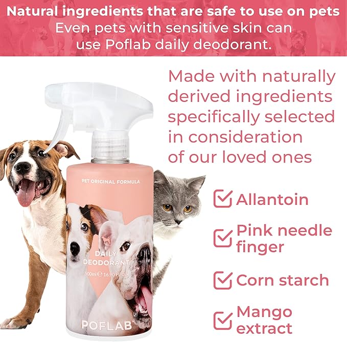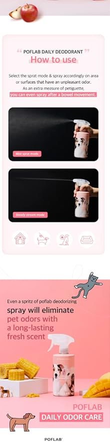 • Natural ingredients: Our pet deodorizer is made with a blend of natural ingredients that are not only effective at neutralizing odors but also gentle on your furry friend's skin. Our unique formula includes Allantoin, Pink Needle Flower Extract, Cornstarch and Mango Extract. These ingredients work together to eliminate odor-causing microbes and keep your pet feeling fresh and clean