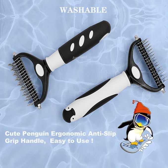 • 🐧Penguin dog deshedding tool: Penguin handle design, You will find the dematting brush for cats is fun and useful to grooming your dog or cat and let your pet will love being brushed!