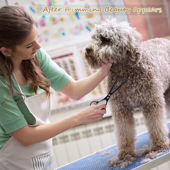 • ★Professional Pet Grooming Scissors Kit★-The kit includes 1 × 7.3-inch thinning shear, 1 × 7.7-inch curved scissor, 1 × 7.7-inch straight scissor, 1 × pet comb, 1 × cleaning cloth, 1 × black leather case