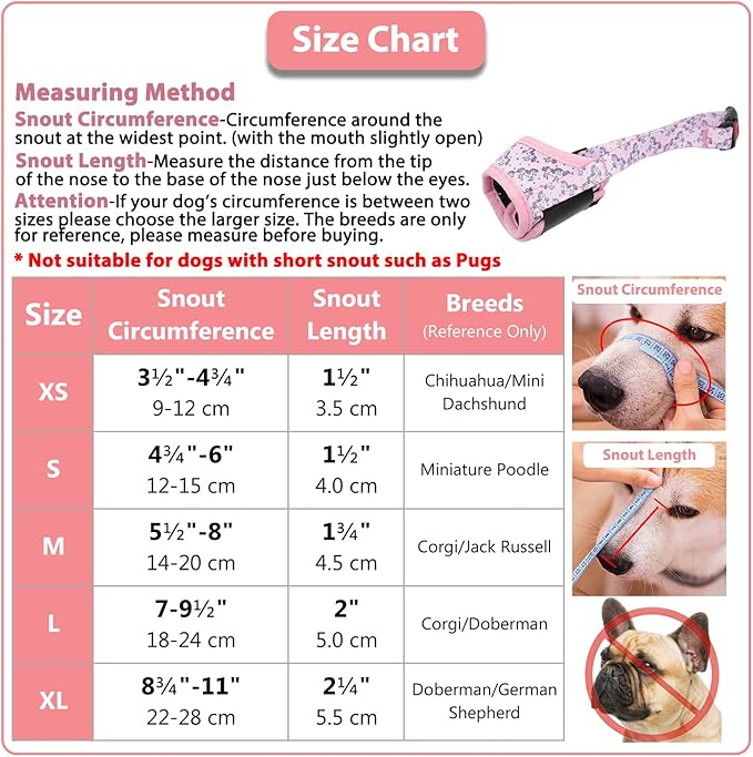 • Muzzle for Small Dogs-Size S is suitable for snout circumference between 4¾" and 6", and snout length that is greater than 1½”. Please measure twice before buying. The small dog muzzle is fit for Dachshund, Schnauzer, Yorkshire Terrier, and so on. If you have any problems with our small dog muzzle for barking, we are happy to help you.