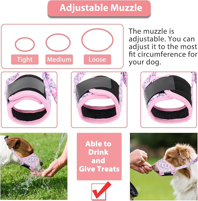 LUCKYPAW Dog Muzzle, Soft Dog Muzzles for Small Medium Large Dogs, Breathable Muzzles to Stop Biting and Chewing with Pattern, Allows Panting and Drinking (S-(Snout 4¾"-6"), Pink Unicone)