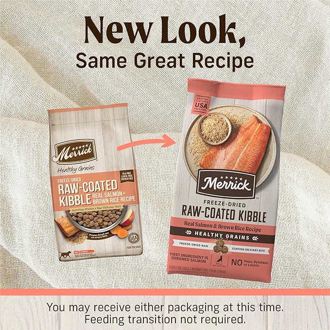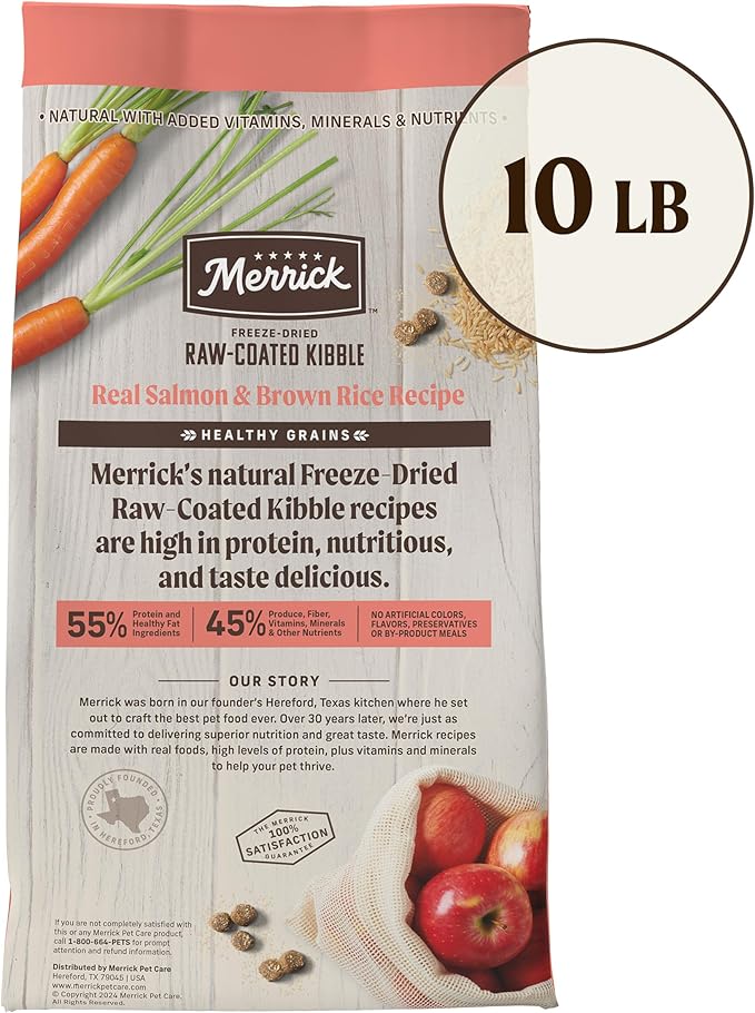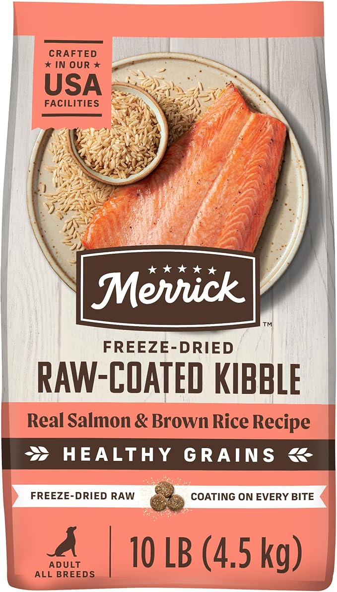 • Merrick Healthy Grains Freeze Dried Raw Coated Kibble, Salmon And Brown Rice Recipe, Natural With Added Vitamins And Minerals High Protein Adult Dry Dog Food