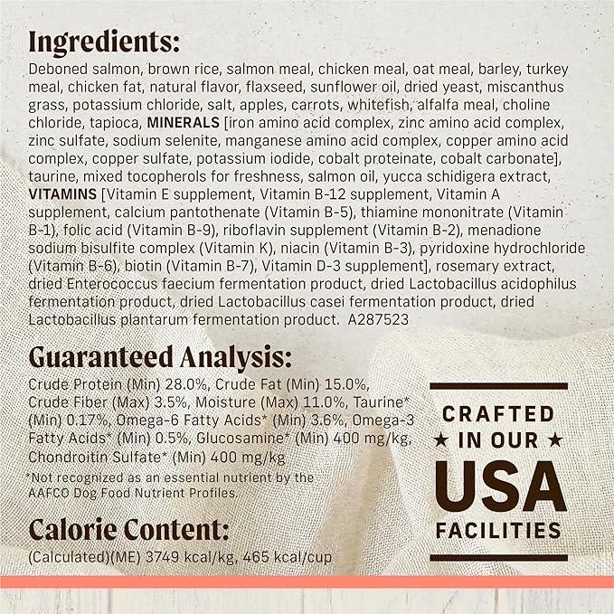 • Made with high-quality proteins to help maintain lean muscle. This salmon dog food formula includes omega-6 and omega-3 fatty acids to promote healthy skin and coat
