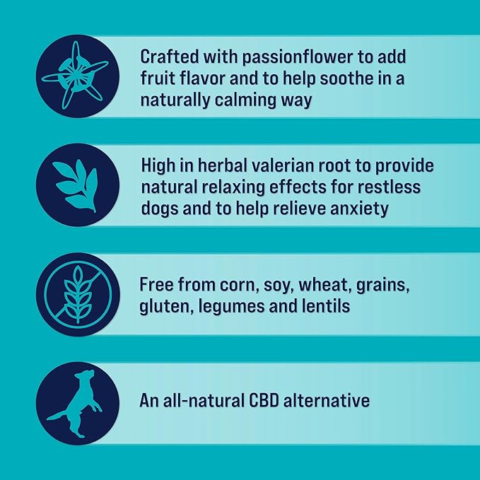 • Anxiety Relief: These calming dog treats help relieve your dog’s stress or separation anxiety, made with naturally calming passionflower and valerian root to aid stress relief