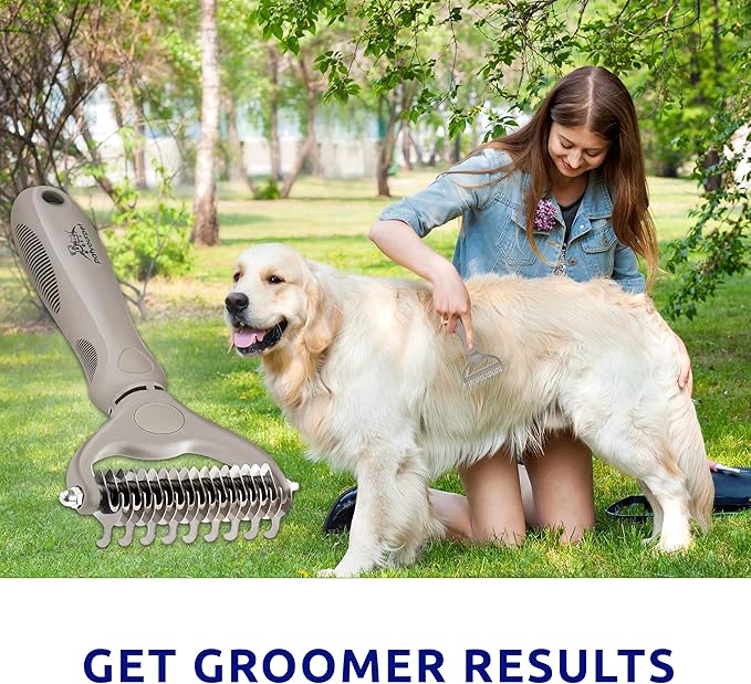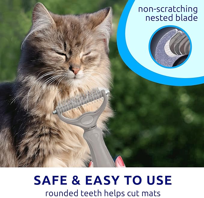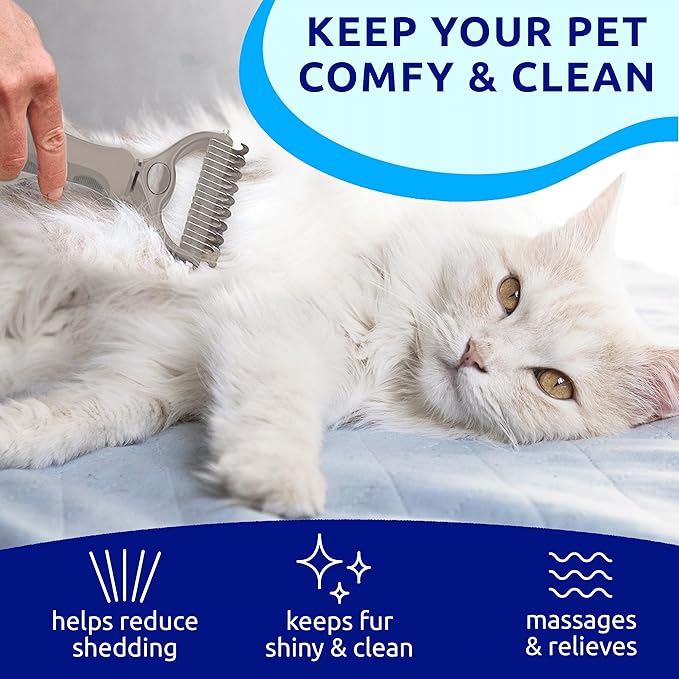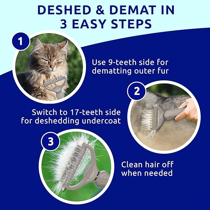 • Dual-Head Design: 2 sides, 2 coats, 1 tool! Use the 9-teeth side of this dog and cat brush for smooth dematting, and the 17-teeth side for quick coat thinning and deshedding.
