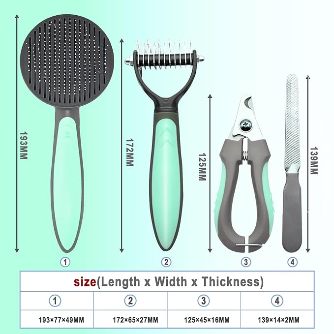 • 【PET GROOMING BRUSH SET】Pet grooming brush kit should be a must for all the pets family, dogs, cats and rabbits; including 4 kinds of different pet grooming Tool(1 pets dog brush, a dematting comb with 2 Sided, a nail clipper, a nail file), which is sufficient to fulfil the daily care for pet hair loss.