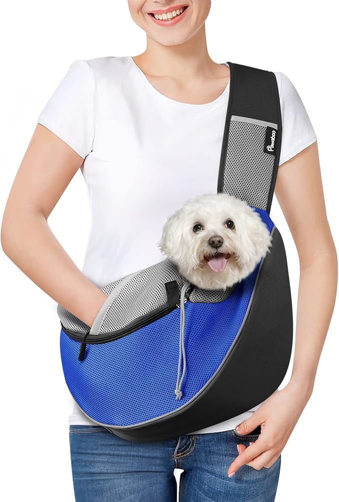 Pawaboo Dog Sling Carrier, Dog Papoose with Zipper Touch Pocket, Hand Free Breathable Mesh Puppy Carrier, Crossbody Satchel Dog Purse with Adjustable Strap for Outdoor Travel, Blue, Large