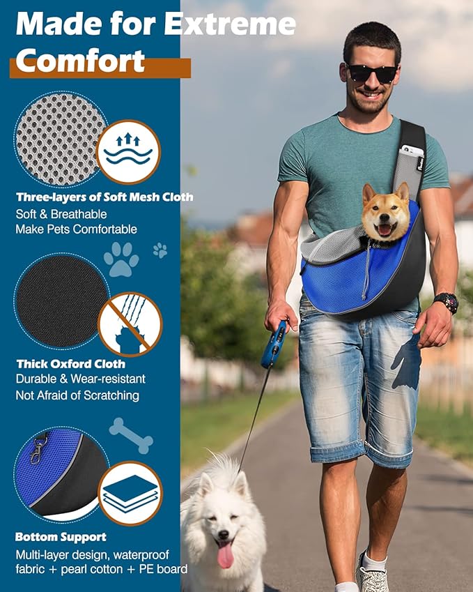 • Multiple Pockets: Dog carrier sling has zippered pocket on the back that can be used for daily supplies. The shoulder strap side pocket can be used to place mobile phones within 6.1 inches, and the D-buckle can be used to hang foldable bowls, keys, and other small items. With strong storage performance, the dog carrier bag is designed with the right mesh pocket.