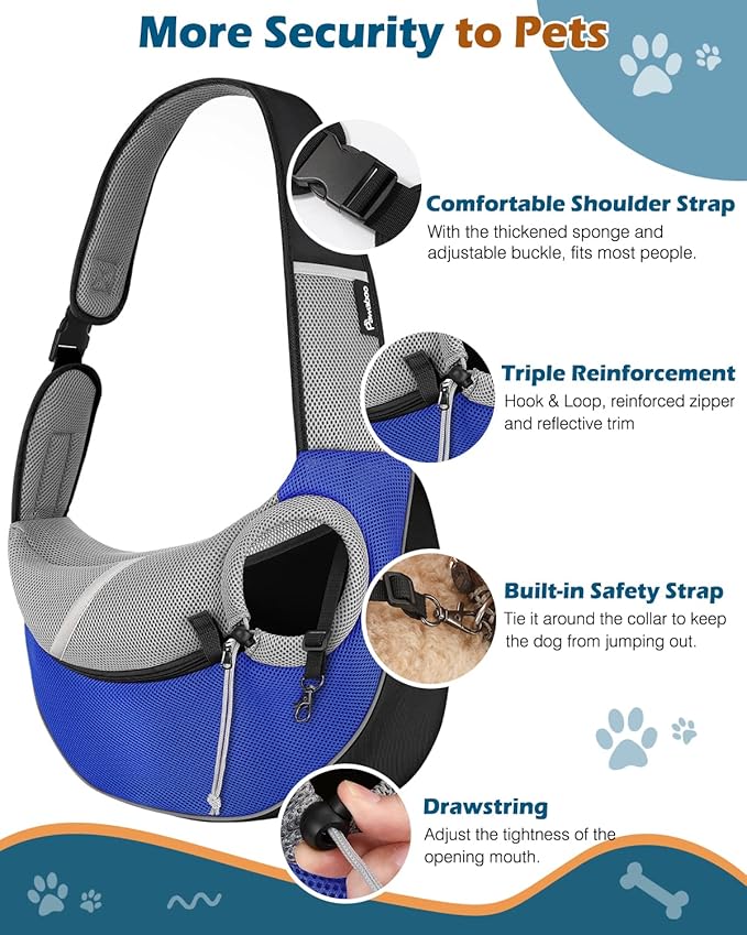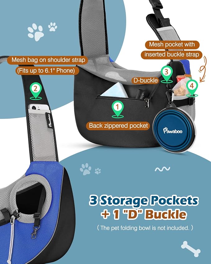 • Multiple Pockets: Dog carrier sling has zippered pocket on the back that can be used for daily supplies. The shoulder strap side pocket can be used to place mobile phones within 6.1 inches, and the D-buckle can be used to hang foldable bowls, keys, and other small items. With strong storage performance, the dog carrier bag is designed with the right mesh pocket.